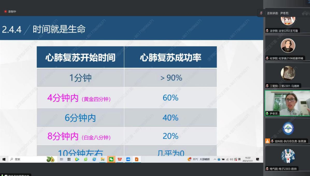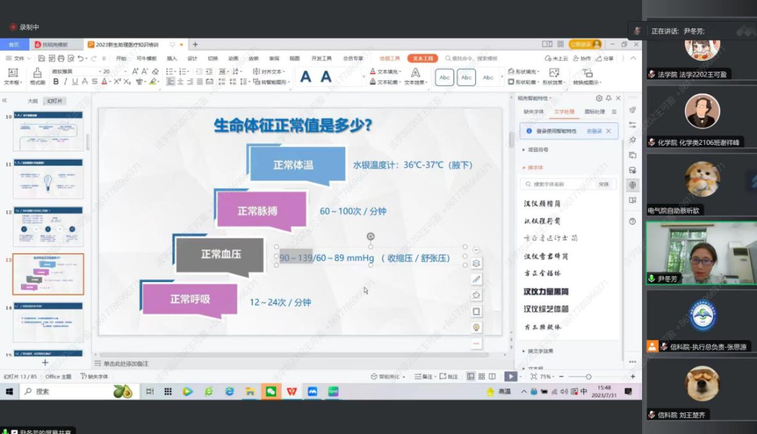 为确保迎新工作及新生军训的安全性,提升迎新团队成员处理突发事件的能力。2023年7月31日,球友会2023级迎新团队与各公司共同开展医疗知识培训。本次培训由校医院尹冬芳老师主持,2023级迎新团队全体成员参加。
