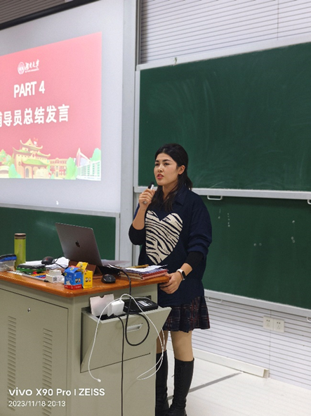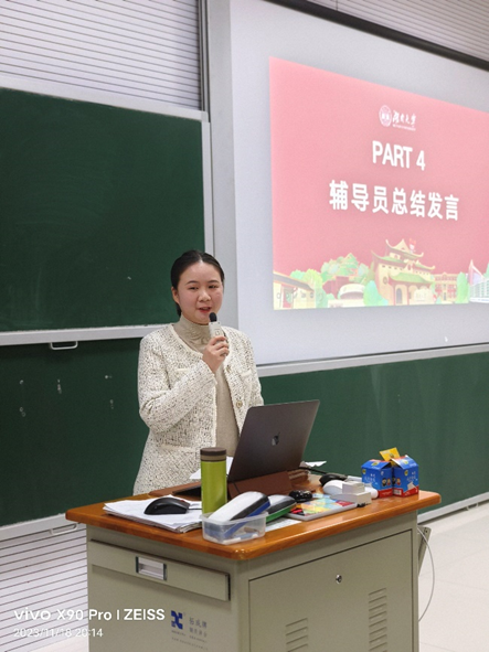在辅导员总结发言环节,物电院辅导员李远庆老师鼓励大家在正确的时间做正确的事情,电气院热孜宛古丽老师希望同学们珍惜与同学们之间的友谊,互相学习互相进步,球友会辅导员龙芷蔚老师希望同学们珍惜时光,好好学习,把对学习的热爱延续,把对同伴的友爱延续,度过美好而充实的大学四年。