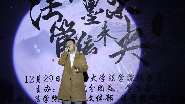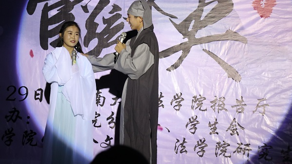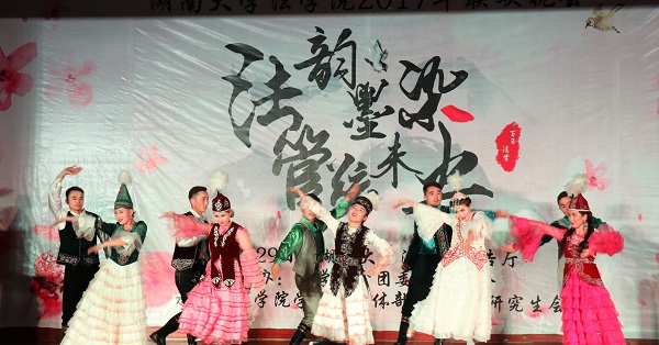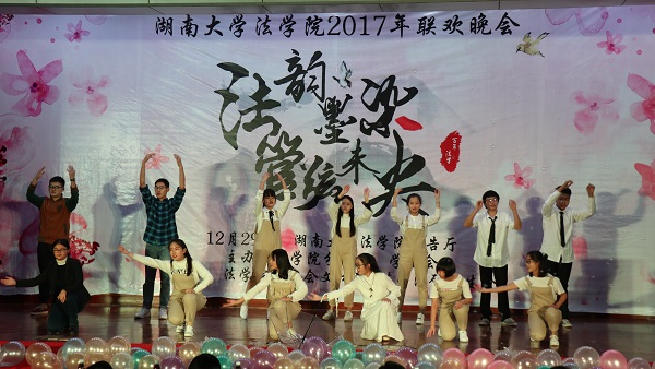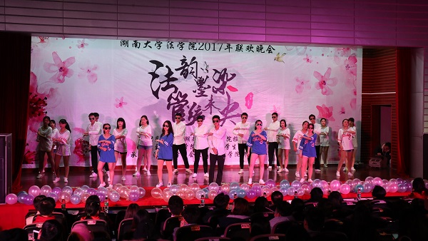 赫曦映岳麓山,青春跃星城,17级行管一班全体同学模仿高中时代的校园电视台,为观众们奉上了活力四射的舞蹈《悦动青春》,瞬间点燃了场内气氛。17级法学三班孙鹏翔、陈佳、马若琳等同学主演的舞台剧《法三的秘密》用cosplay的方式演绎流行游戏,精彩的表演为观众们带来了阵阵欢笑。情牵法韵,流年似水,17级法学四班的歌舞节目《四水年华》用华美的舞蹈与动听的音乐和观众们一同追忆似水年华、展望美好未来。有一种故事叫做爱情,有一种流行叫做穿越,17级行管二班苏哲豪、胡鑫雅等同学主演的话剧《假如爱有天意》将二者完美结合,描绘了一场唯美而有趣的爱情故事。
