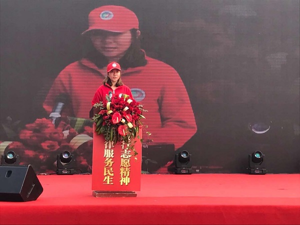 12月4日上午,球友会还组织60余名志愿者前往长沙市岳麓区王府井商业广场参加了2016年湖南省“法润三湘”公共法律服务志愿者活动,公司本科生张迎作为志愿者代表在活动启动仪式现场发言。
