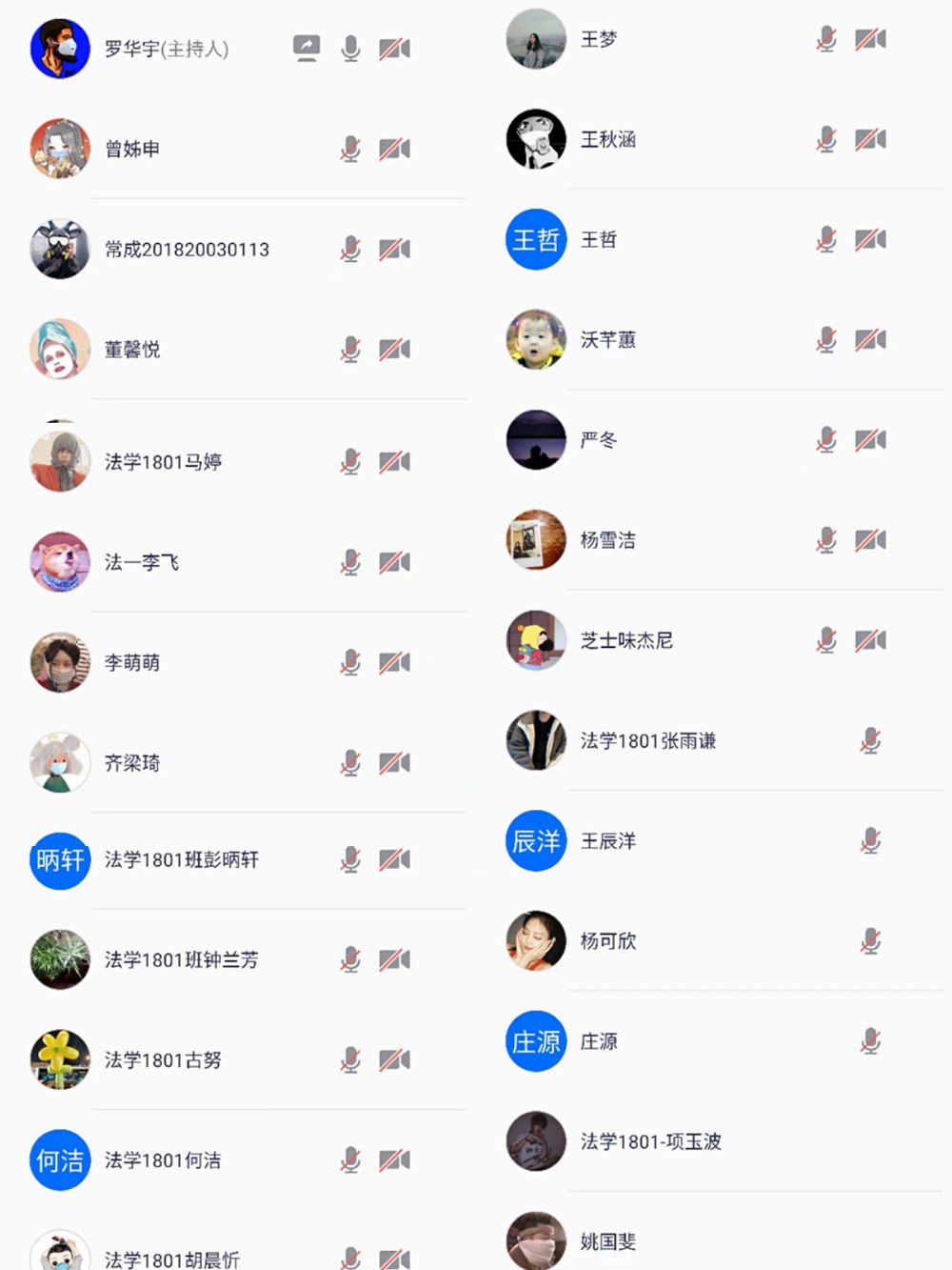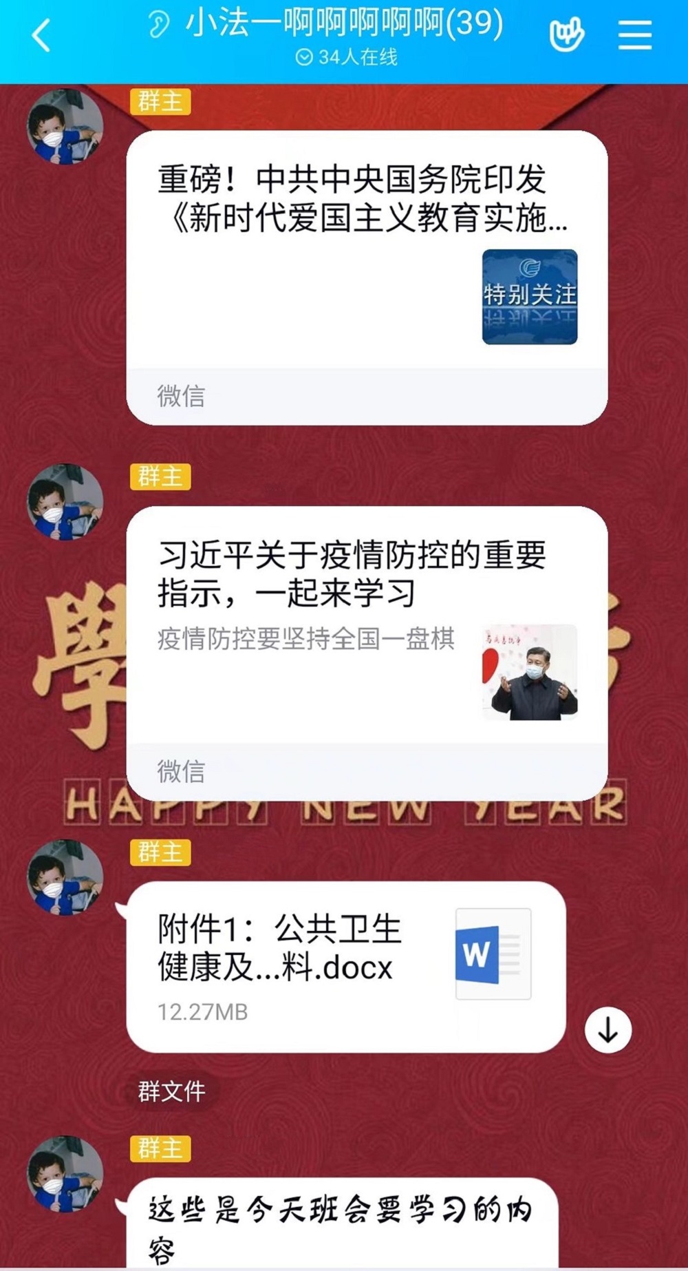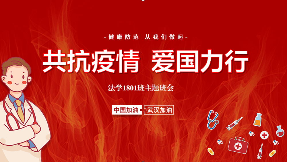 在举国上下万众一心、众志成城做好新冠肺炎疫情防控工作的特殊时刻,为进一步贯彻爱国主义教育,激发同学们的责任与当担,增强打赢疫情防控人民战、总体战、阻击战的信心和决心,法学1801班于3月16日组织开展“共抗疫情,爱国力行”线上主题班会。班主任汪全军老师、辅导员刘璇子老师及班级全体同学共同参加班会。