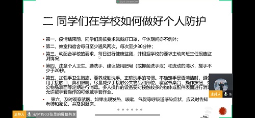 科普知识环节结束后,班主任汪叶老师与同学们进行交流。汪叶老师从如何更好生活和如何更好学习两个方面展开讨论,叮嘱每一位员工注意身体健康,学会保护好自己,也提醒所有同学要利用在家的时间好好读书,做好知识的积累。同时汪叶老师强调,本学期学习任务较重,专业课程较多,同学们务必提高自觉性,配合好教师的线上教学工作,确保自己的学习进度,为开学后的学习工作做铺垫。