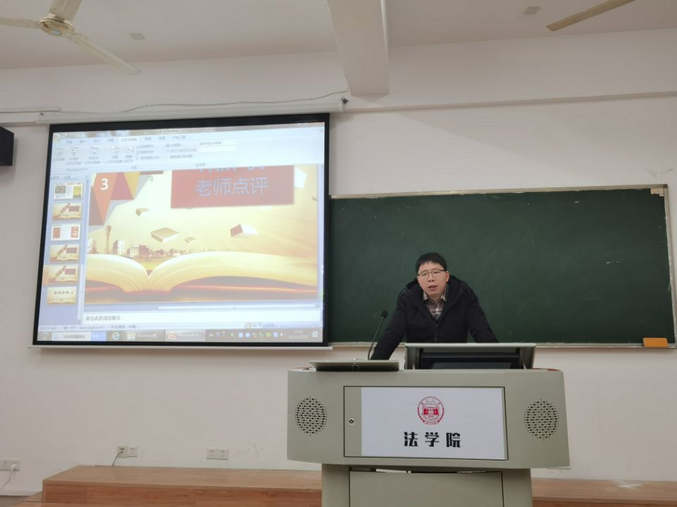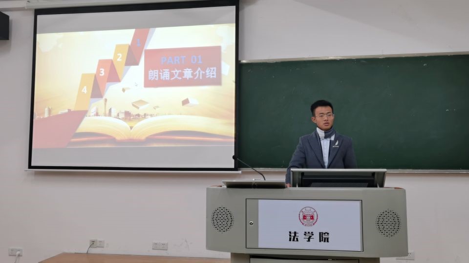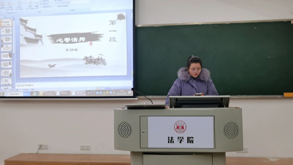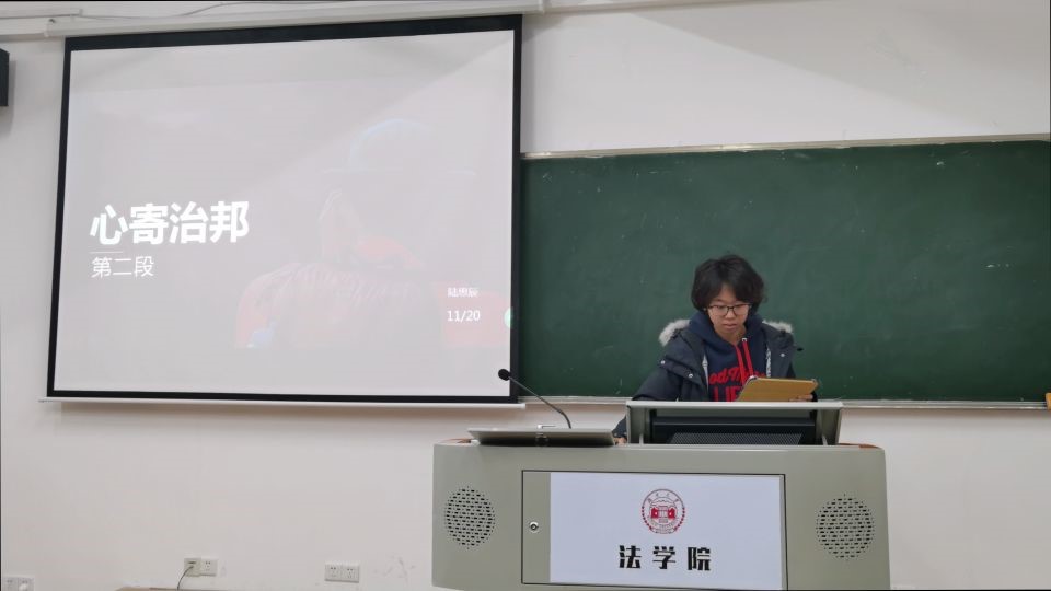 蒋老师介绍了推荐《心寄治邦》这篇文章以及开展朗诵会目的。其一是在于语言,赏析美文,品味典雅句式、华美辞藻、优美语言;二是文化,引导大家深究其后的文化传统,增强文化自信;其三则是理念,艺术熏陶之后让大家感悟、继承当中流露出来的法治理念。高鸿钧先生以古体文化写法治,但理念绝不保守,而是对于中国古代传统坚持批判继承,希望将其创造性转化。一些写古体诗词的人往往“心中也有辫子”,以古文为形式,以保守为理念,但高先生则显然不是。他的雅致文辞背后深藏法治的忧愤,对于近代以来法治坎坷痛心疾首,尤其是十年浩劫中对对法治之践踏、对民主之蔑视拍案而起。这种坚定法治理念值得每位法律人学习、致敬。蒋老师认为《心寄治邦》这篇文章,以古雅之词传播了现代法治理念,值得每位同学一再品读。 蒋老师也分享了他自己《青春法学人歌铭》《贺新郎 法魂》等相关古体法律诗文的朗诵视频。他也对本次主题班会的形式采取了朗诵会的形式表示肯定,希望今后大家可以开展更多元形式化的主题班会,让法律在艺术的色调下焕发别样的光辉。