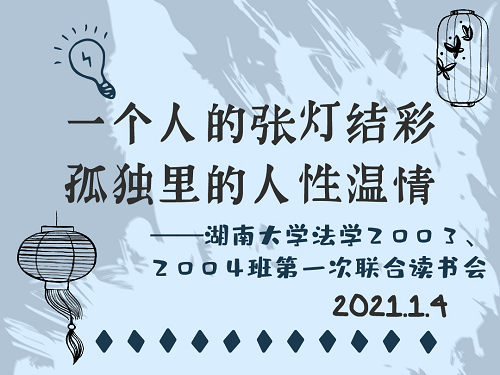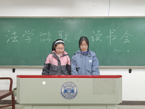 为了提高同学们的思辨能力和社会阅历,qy球友会法学2003班、法学2004班全体同学于2021年1月4日晚在南校区综合教学楼举行了第一次联合读书会。法学2003班学习委员李子韩、法学2004班学习委员杨仁共同担任主持人。毛靖雯和卢检花、陈慧婷和蒋婕、俞嘉莉和邹倩懿、张丽媛和刘潇潇、刘宇芩和杨仁总共十名同学组成了五个分享小组。